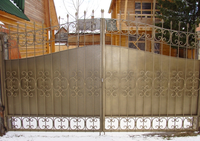 Кованые ворота частично зашитые металлическим листом с полимерным покрытием по каталогу RAL.