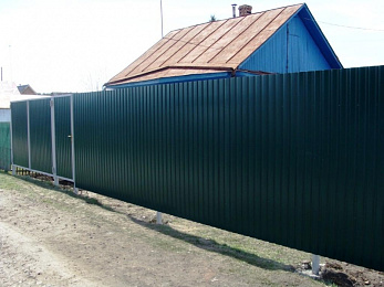 Данный забор из профнастила широко используется в дачном и коттеджном строительстве. Для данного забора рекомендуем металлический п-образный профиль на верх забора, который придаст профнастилу более эстетичный и законченный вид.